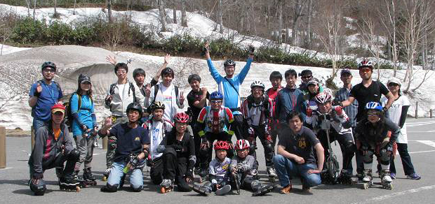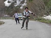 標高差があるので、参加者はそれぞれ工夫をしていました。 ブレーキ付きの1輪車で滑る人、自転車をブレーキ代わりに使う人、自力でがっつり滑る人、スキーのオフトレのように、ストックを使う人。 最後尾には疲れたら乗り込めるようにトラックや乗用車がいてくれたので、安心して20kmを滑走することが出来ました。 |